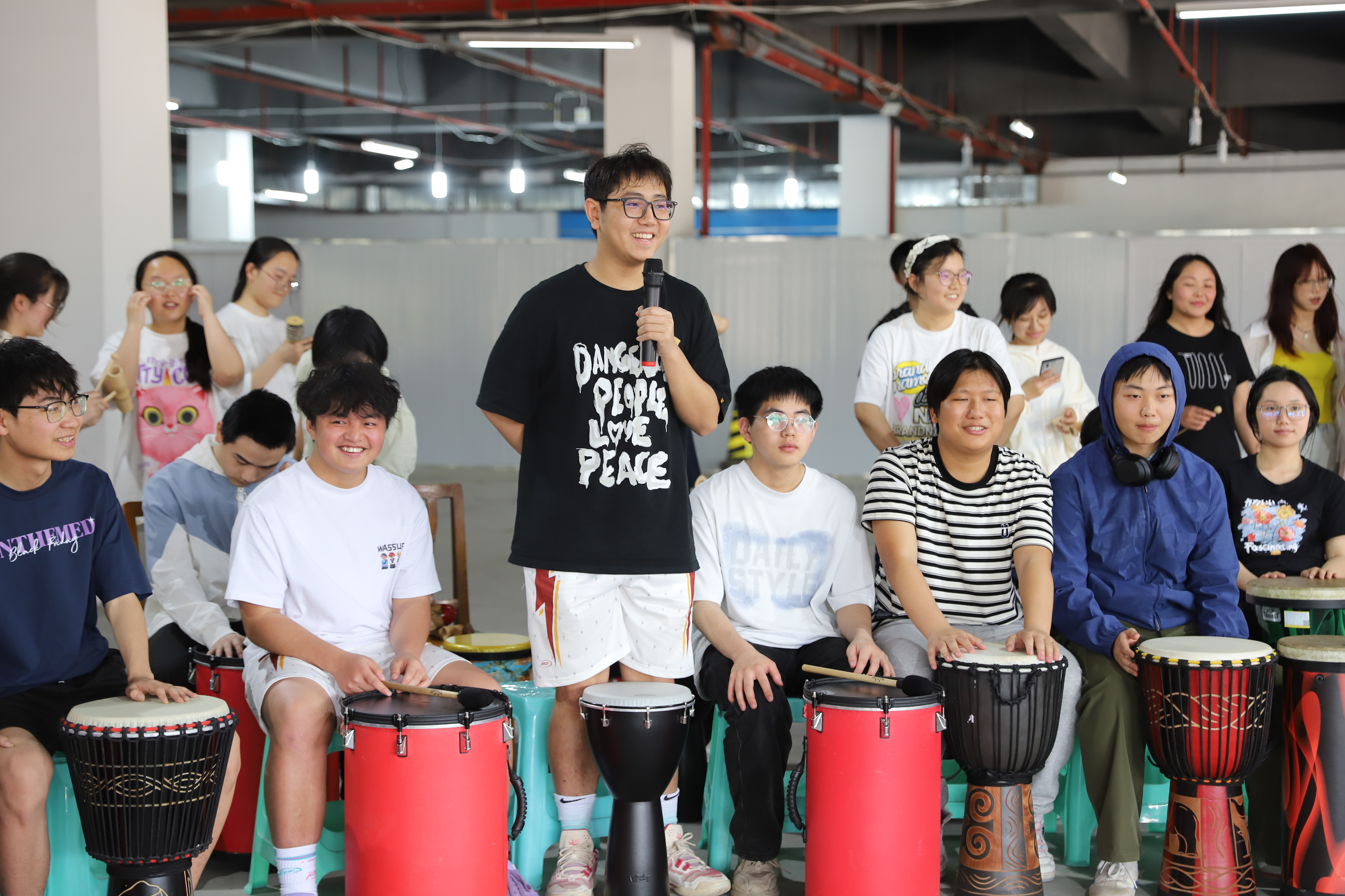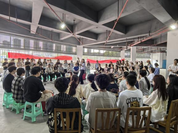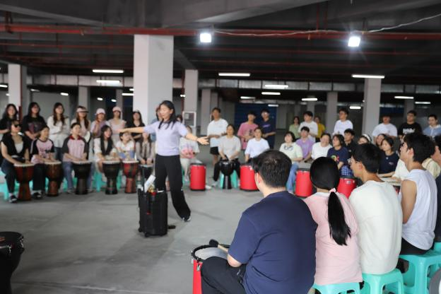 鼓圈活动则通过鼓节奏共振的沉浸式体验引导同学们关注身心健康协同。活动中,内圈的同学打着鼓,外圈的同学则跟随鼓的节奏,使用其他乐器一同演奏。这种将鼓声与其他乐器相融的方式,不仅强化了同学们的肢体协调与心肺活力,更在即兴协作中培育了团队默契与抗压韧性。