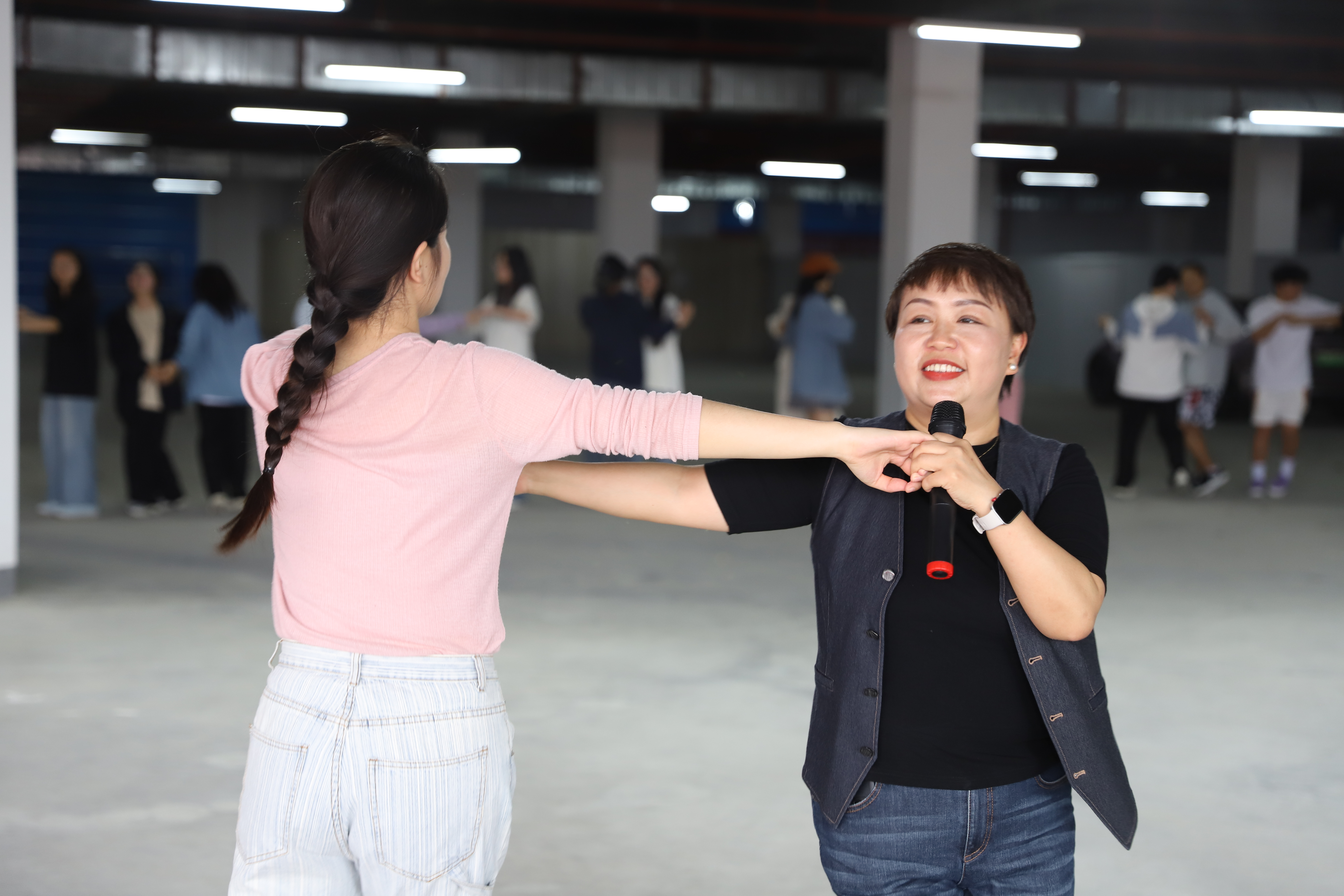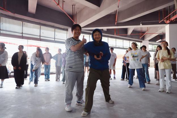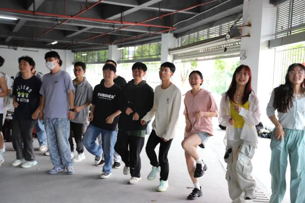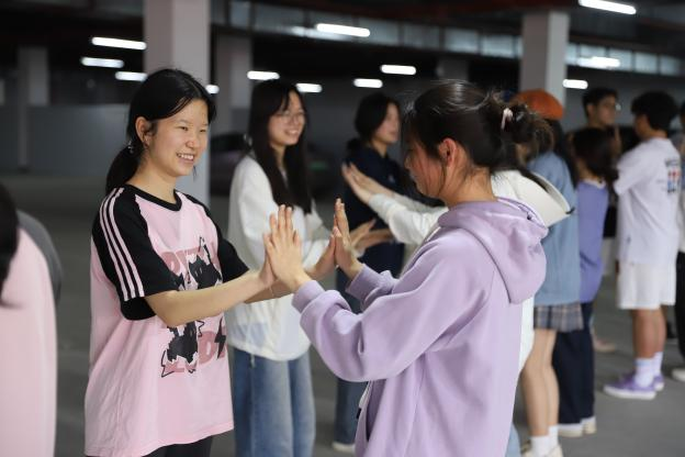 “十指相触”游戏同学们两两一组,交叉相站并跟随音乐节拍交换搭档,通过非语言的交流方式建立初步的信任关系,让同学们了解到日常生活中的社交需要双方都主动迈出一步。接着进行的“小小雕塑家”游戏,一人跟随节奏帮助“雕塑”同学摆出造型,同学们从活动中认识到生活中自己的想法和他人想法的差异,不仅激发了同学们的创造力和想象力,更重要的让大家学会了换位思考,理解并尊重他人的想法,懂得了在团队协作中不强人所难的重要性。