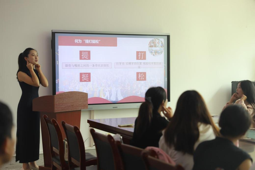 随后的实战演练环节干货满满,从利用“口部操”告别口齿不清,到讲解“提打挺松”的口腔状态、找准腹腔发音的发声位置、掌握共鸣技巧、规范吐字归音,每一项内容,王学洋同学都配有细致的示范与指导,全场同学积极参与跟读训练,现场学习氛围十分活跃。